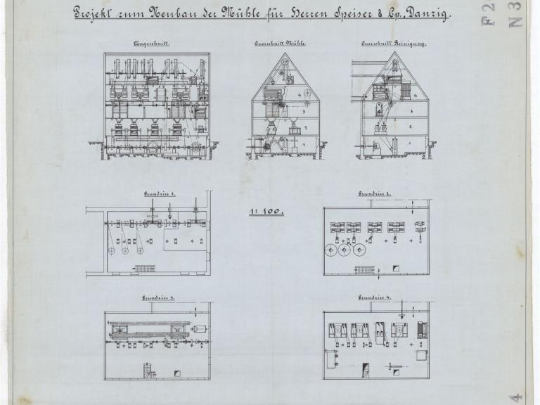 Foto Mitte: Technische Zeichnung: Projekt zum Neubau der Mühle für die Herren Speiser & Co., Danzig