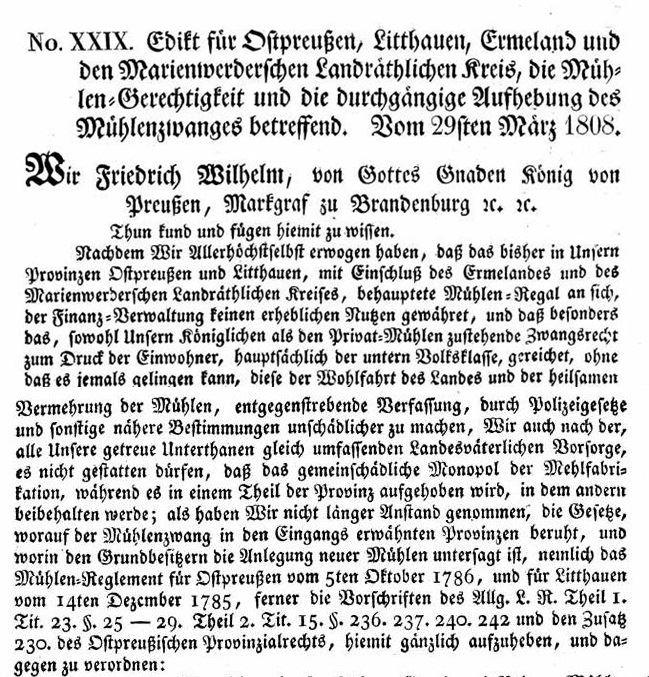In Ostpreußen, Litauen, im Ermland und im landrätlichen Kreis von Marienwerder wird der Mühlenzwang durch ein Edikt vom 29. März 1808 aufgehoben. Sowohl für die Müller als auch für die Bewohner, die ihr Getreide zu Mehl verarbeiten lassen wollen, treten damit eine Reihe von Änderungen in Kraft. Für Johann Wilhelm Hellwich und Johann Friedrich Westphal ist es noch selbstverständlich, dass sie in all ihren Rechten und Pflichten vom Wohlwollen ihres Grundherrn abhängig sind. Friedrich Westphal erlebt die Aufhebung des Mühlenzwangs unmittelbar mit und muss sich auf die neuen Regelungen einstellen und für Johann Carl Westphal und Carl Sigismund Ankermann gelten diese von Beginn an.