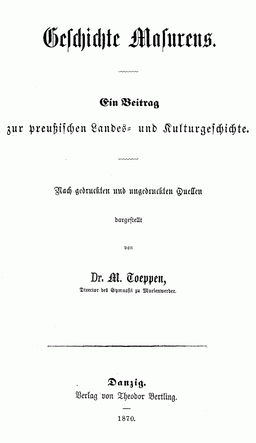 Toeppen, Dr. M.: Geschichte Masurens. Ein Beitrag zur preußischen Landes- und Kulturgeschichte. Danzig 1870, Verlag von Theodor Bertling