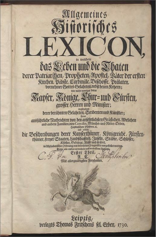 Allgemeines Historisches Lexicon in welchem das Leben und die Thaten derer Patriarchen, Propheten, Apostel, Väter der ersten Kirchen, Päbste, Cardinäle, Bischöffe, Prälaten, vornehmer Gottes=Gelahrten, nebst denen Ketzern; wie nicht weniger derer Kayser, Könige, Chur= und Fürsten, grosser Herren und Minister; ingleichen derer berühmten Gelahrten, Scribenten und Künstler; ferner ausführliche Nachrichten von den ansehnlichsten Gräflichen, Adelichen und andern Familien, von Conciliis, Münchs= und Ritter=Orden,Heydnischen Göttern etc. und endlich die Beschreibungen derer Kayserthümer, Königreiche, Fürsten=thümer, freyer Staaten, Landschafften, Inseln, Städte, Schlösser, Klöster, Gebürge, Flüsse und so fort, in Alphabetischer Ordnung mit bewehrten Zeugnissen vorgestellet werden. Dritte um vieles vermehrte und verbesserte Auflage.